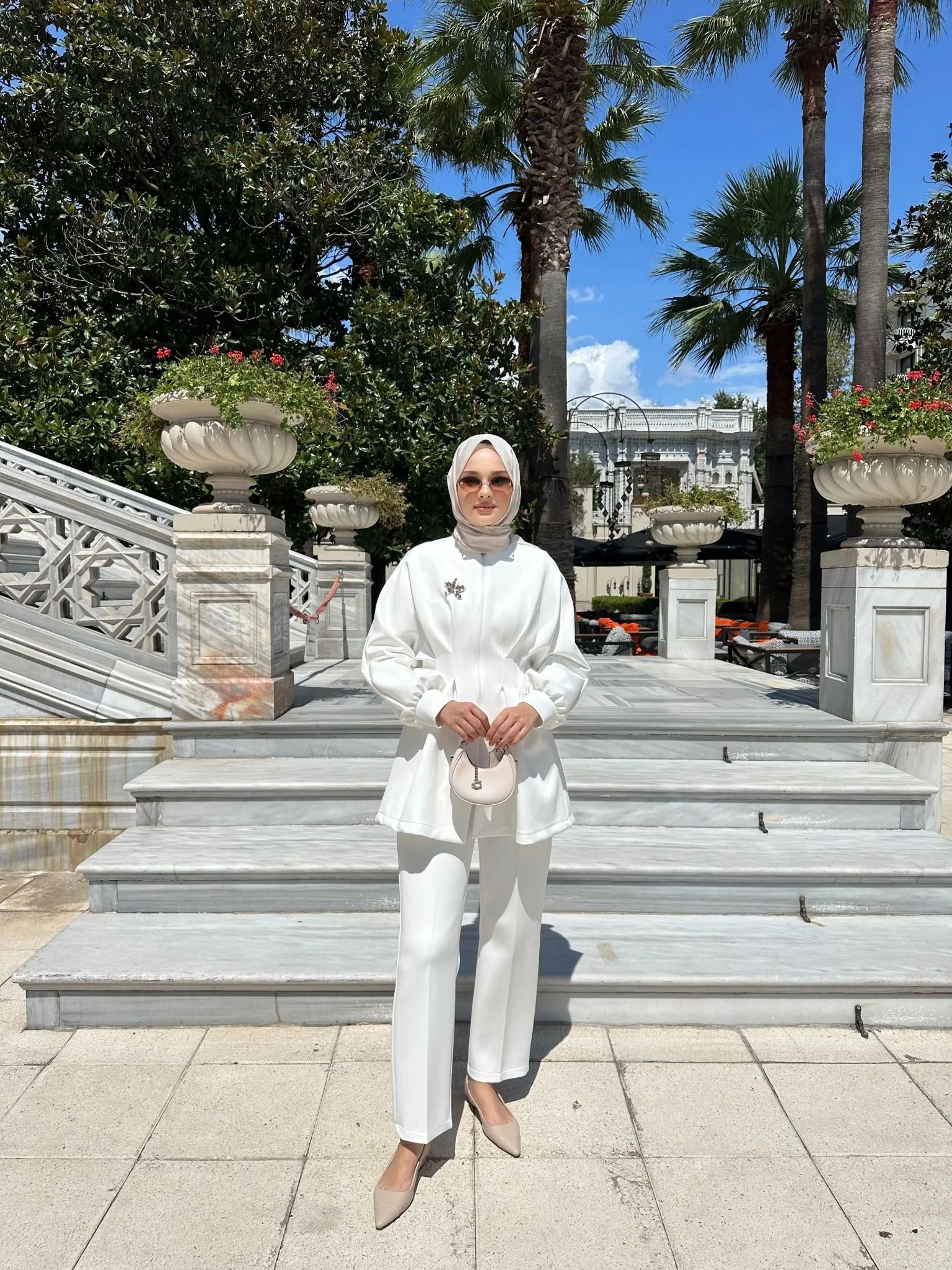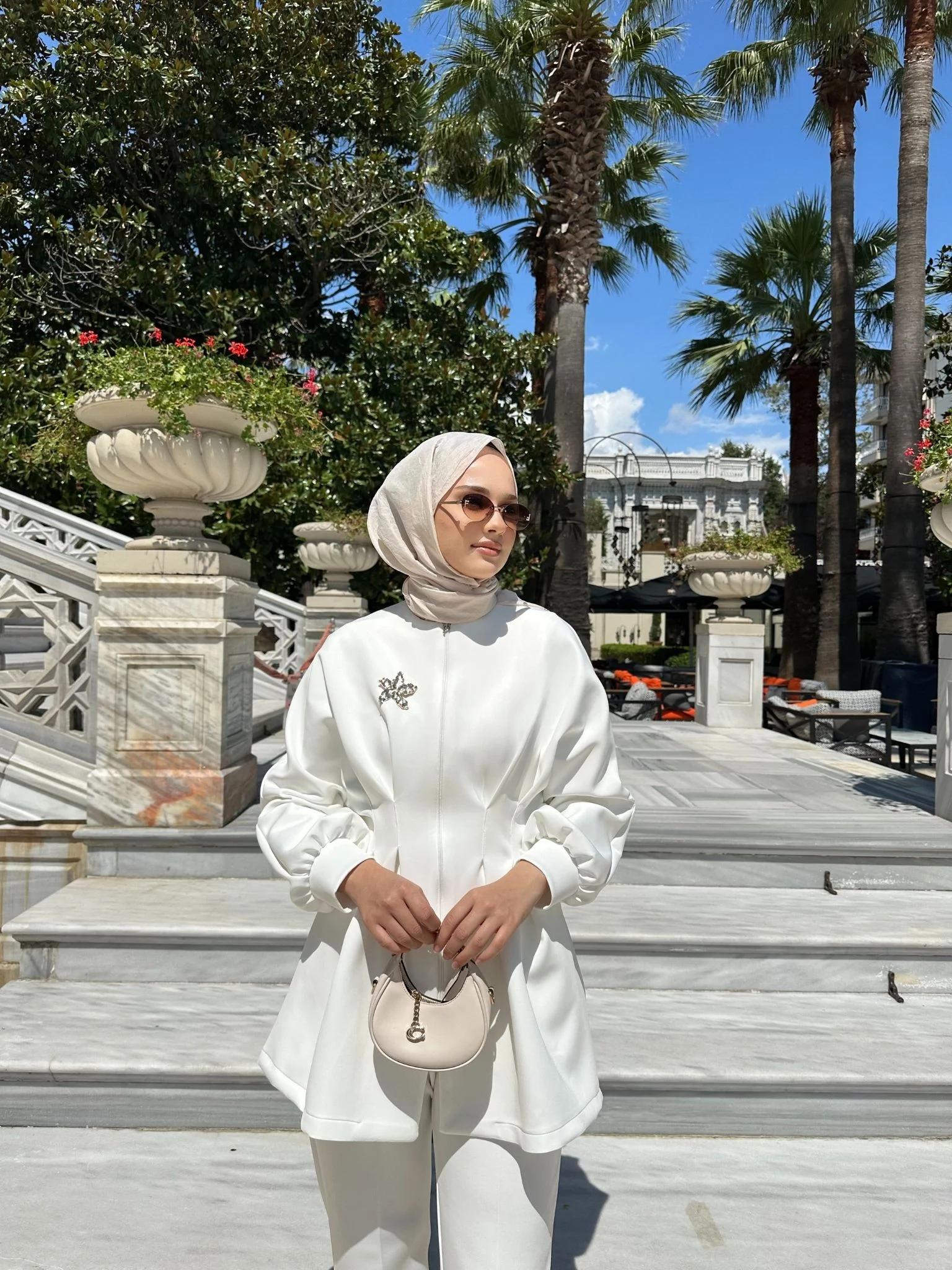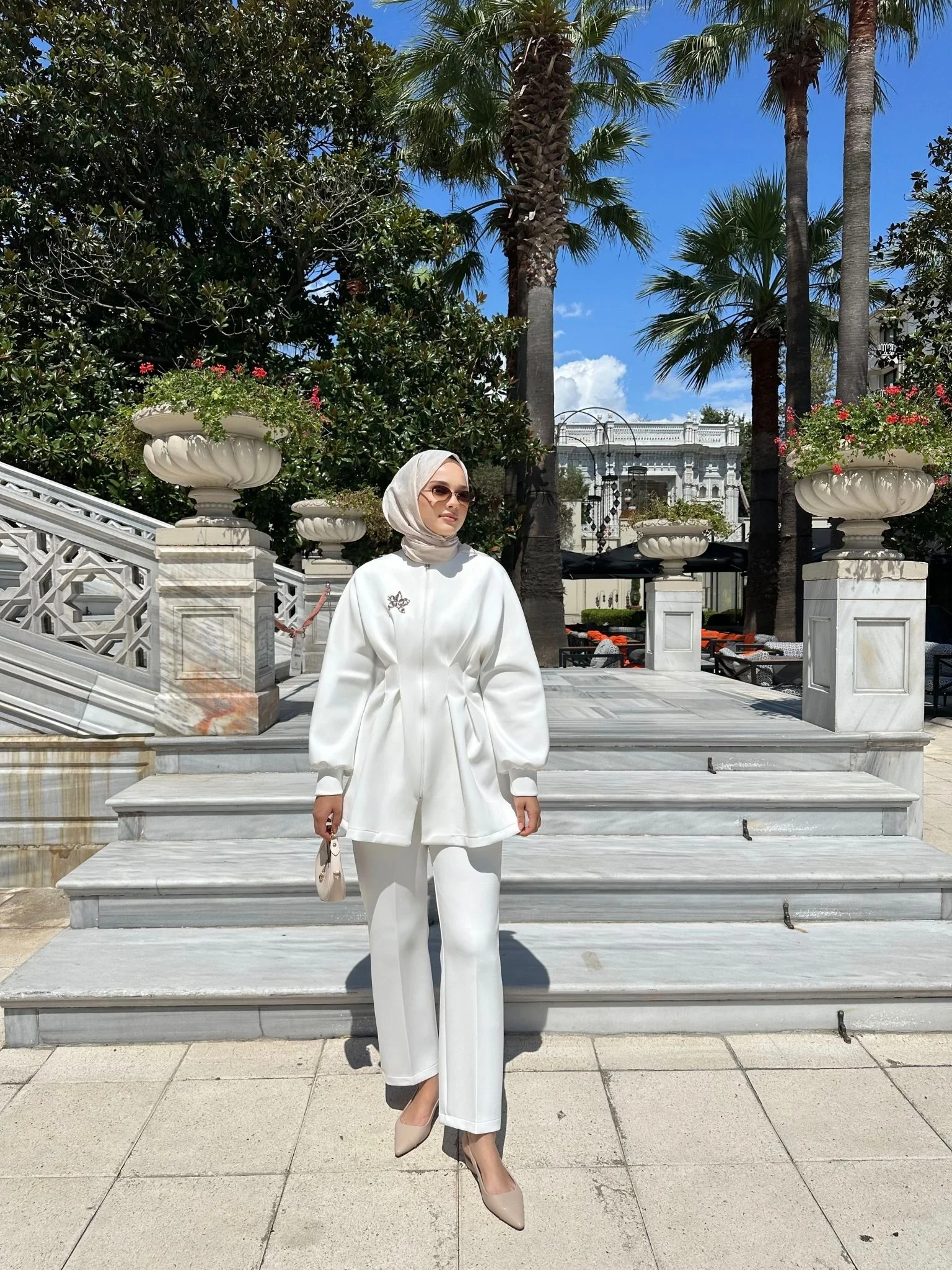 Beli pileli, fermuarlı tasarımıyla modern bir duruş sunan Lora Takım;