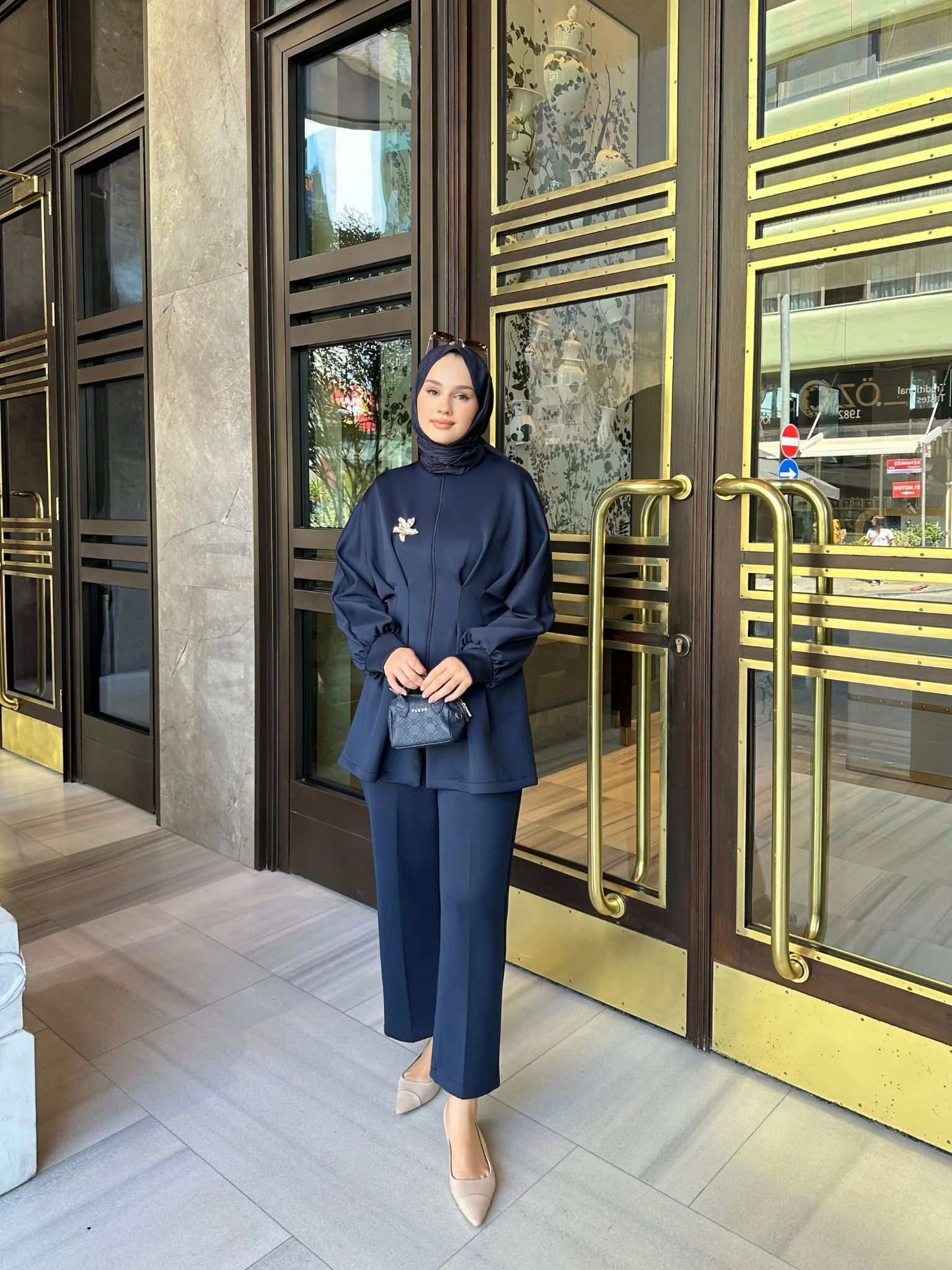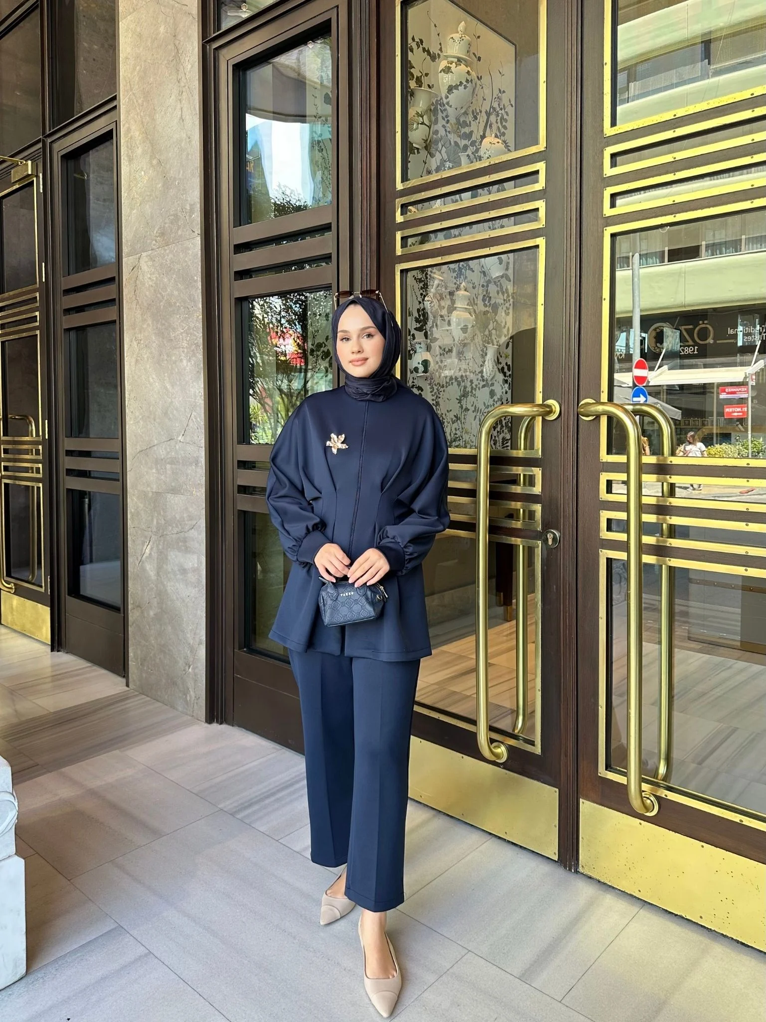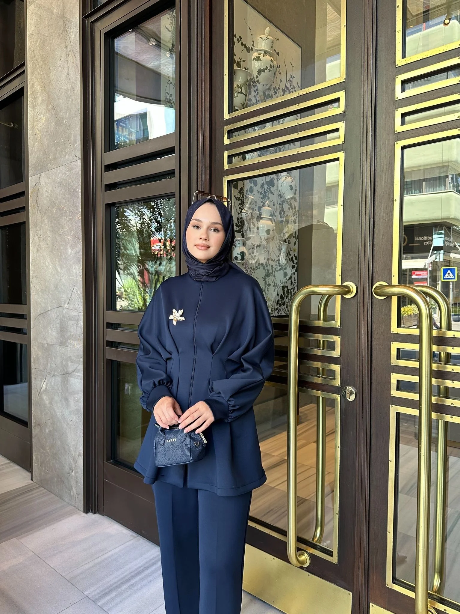 yakası kapalı, yarasa kol detayıyla konforu ve şıklığı bir arada sunar.