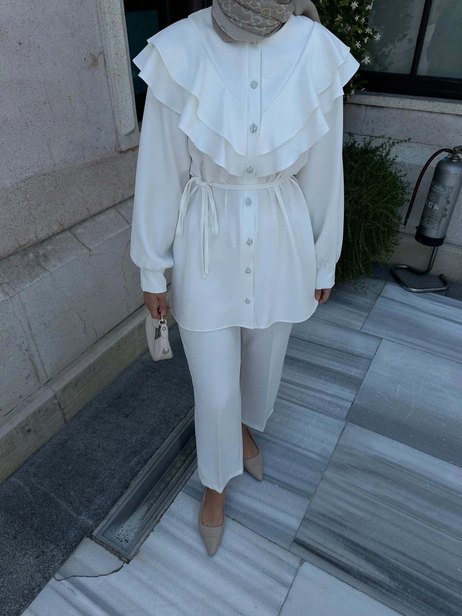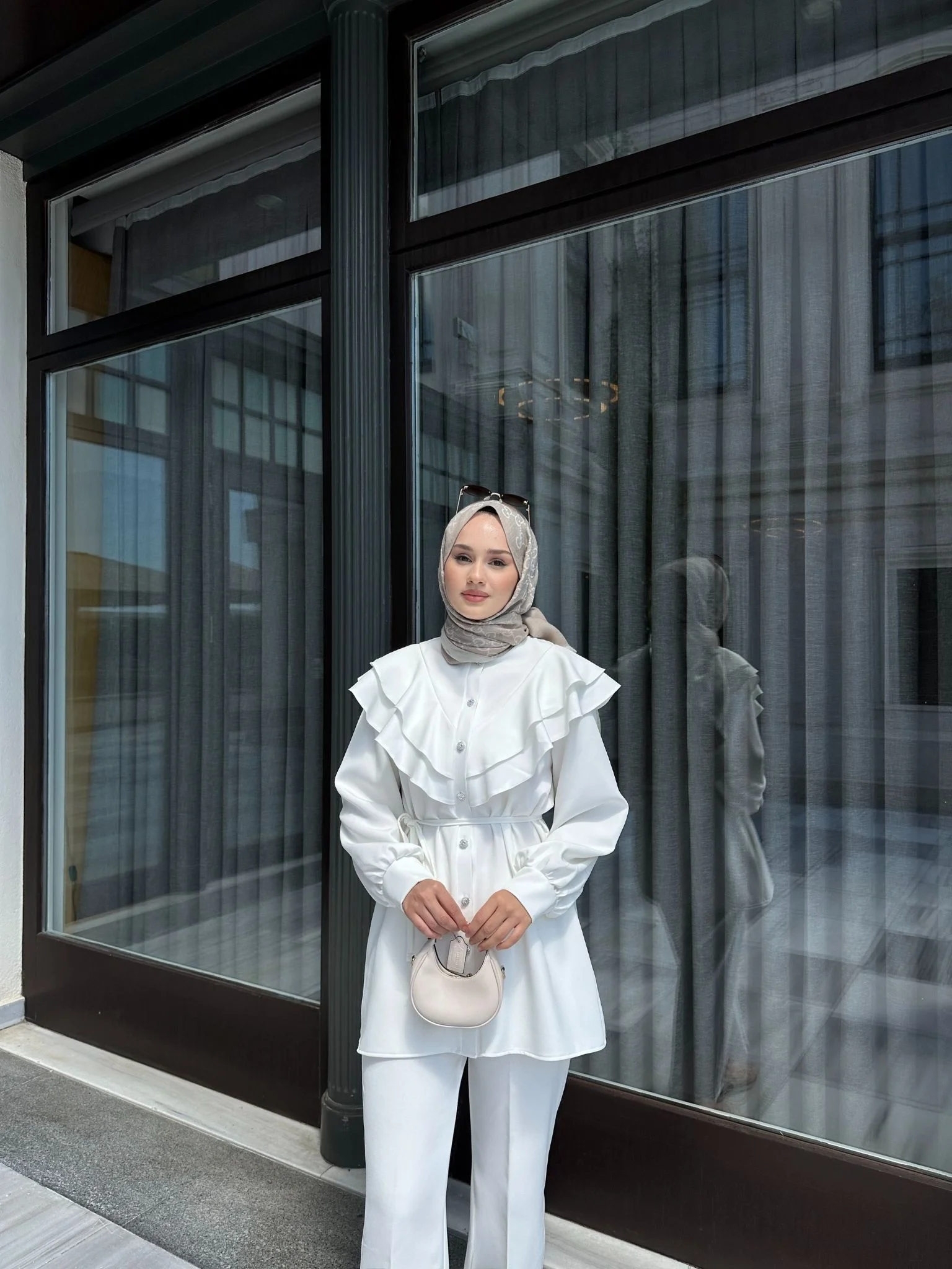 • Düğmeli, volanlı ve yakası kapalı tasarım