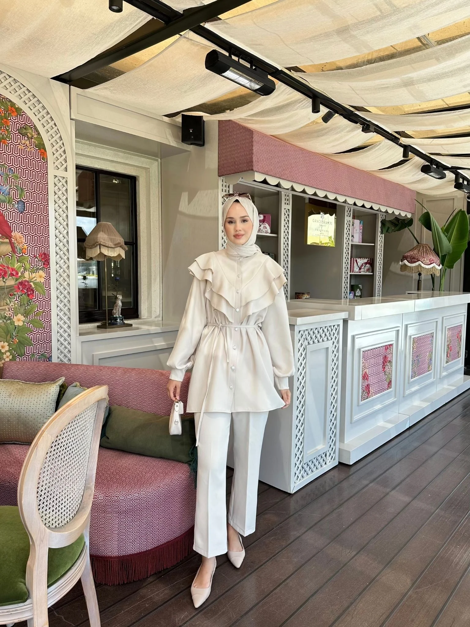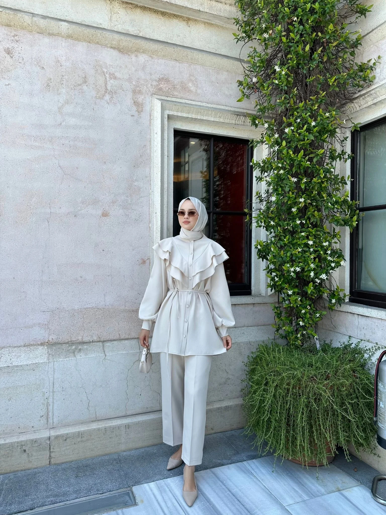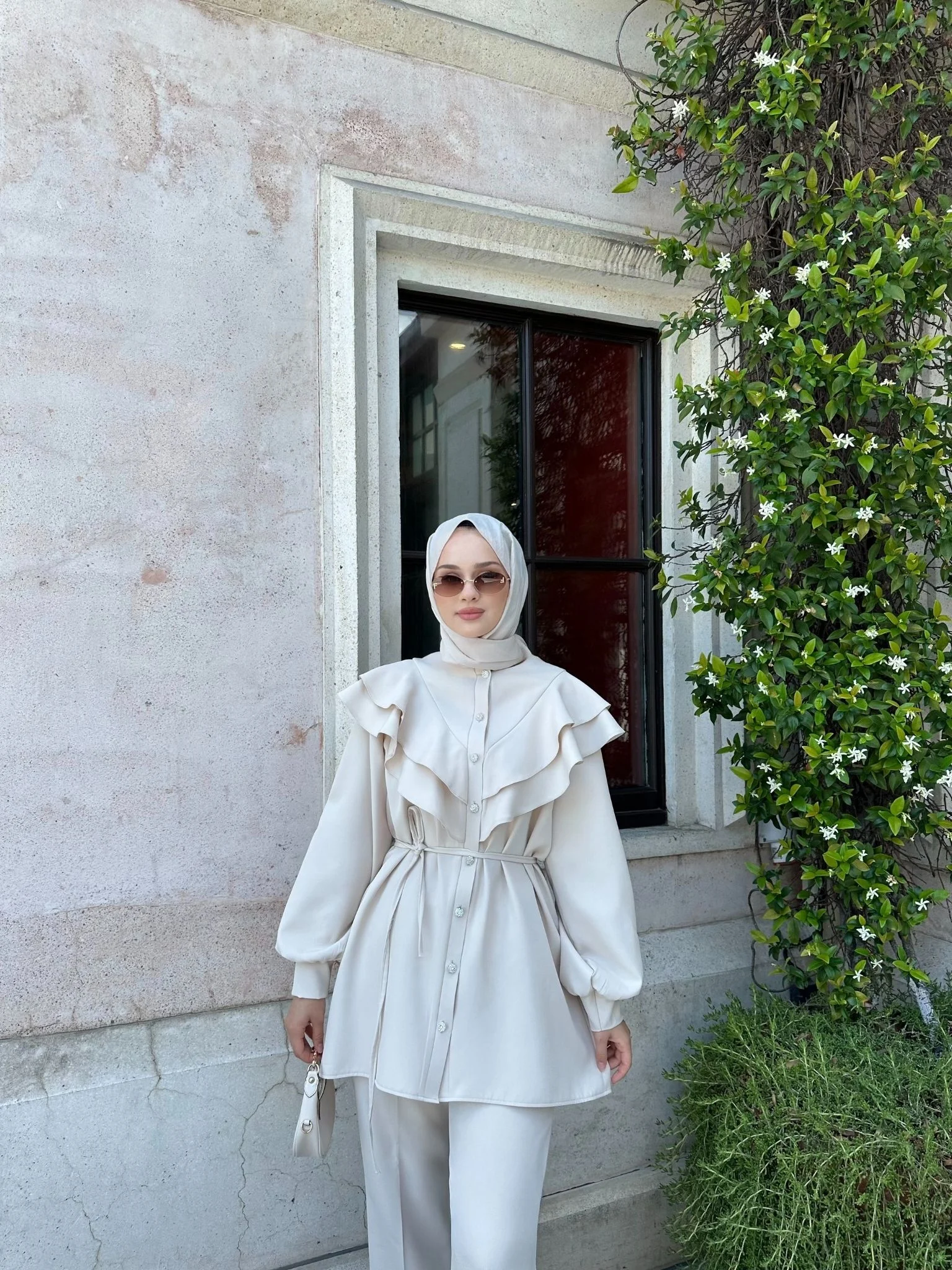 • Düğmeli, volanlı ve yakası kapalı tasarım