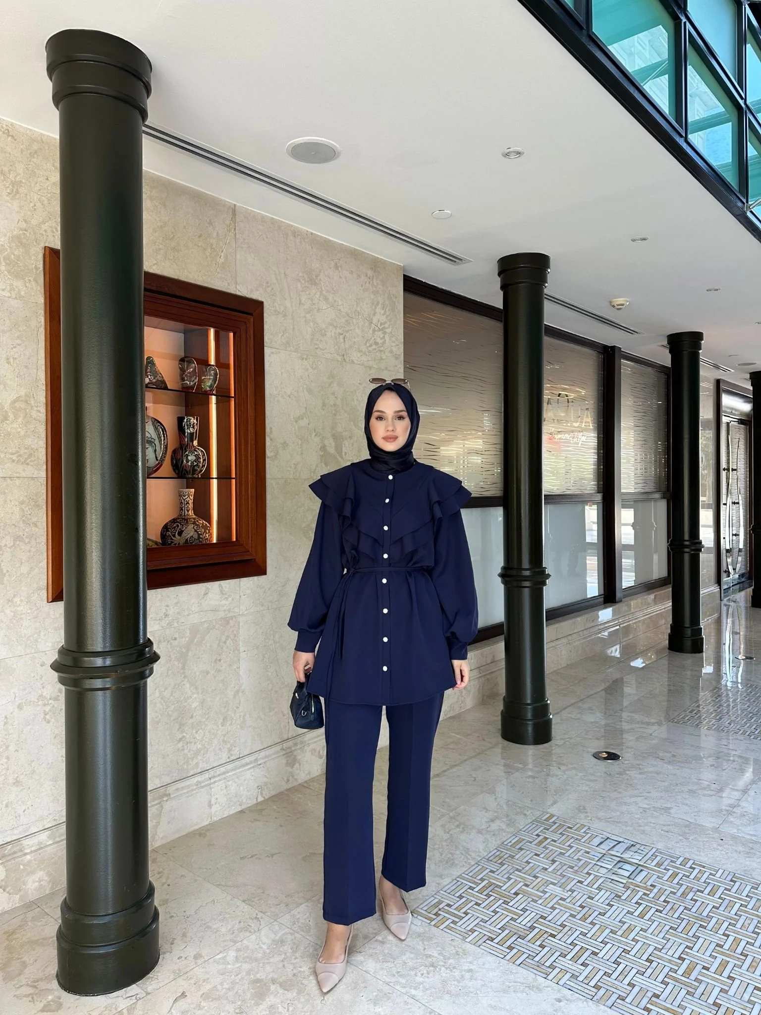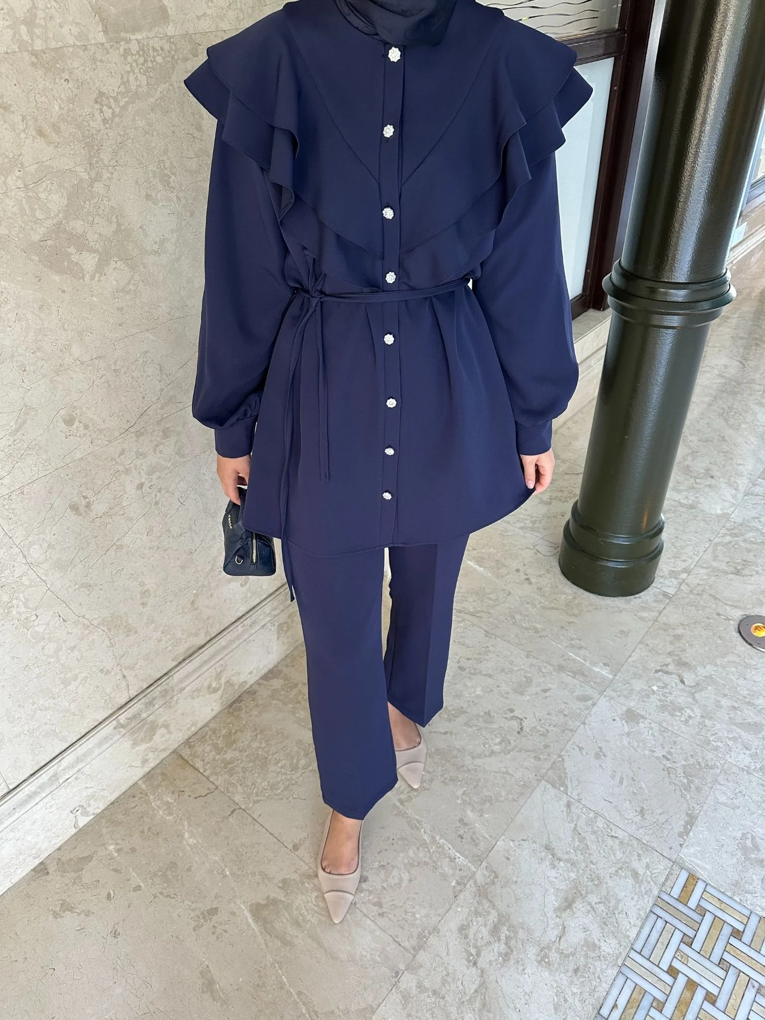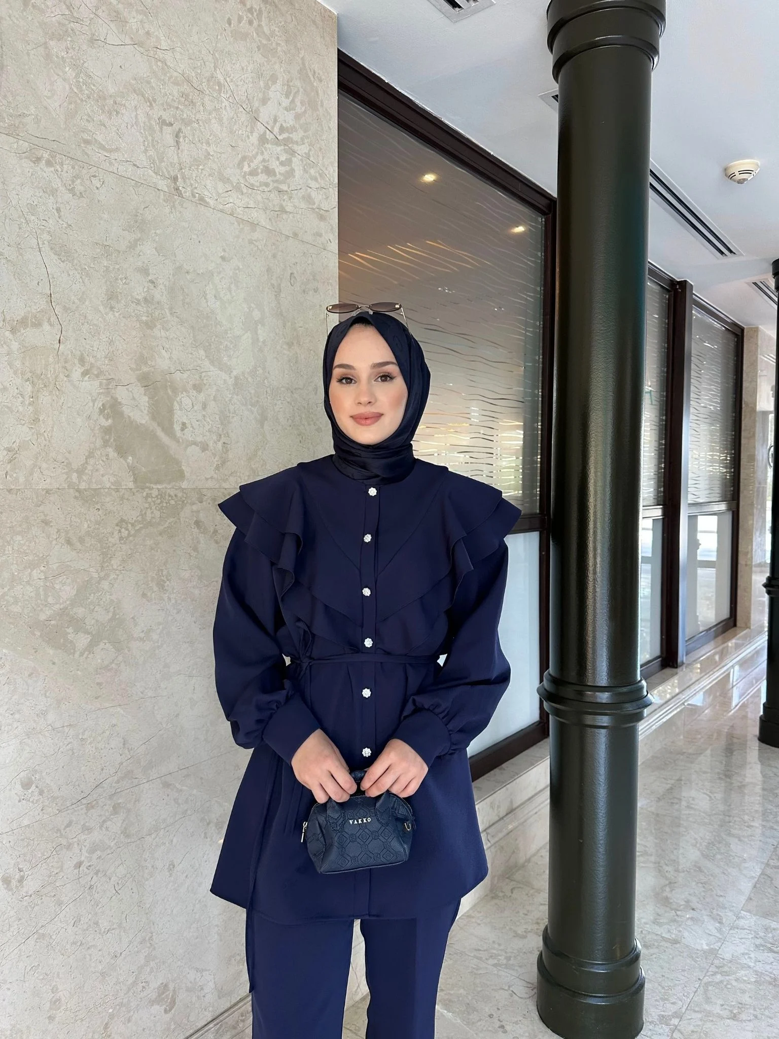 • Düğmeli, volanlı ve yakası kapalı tasarım
