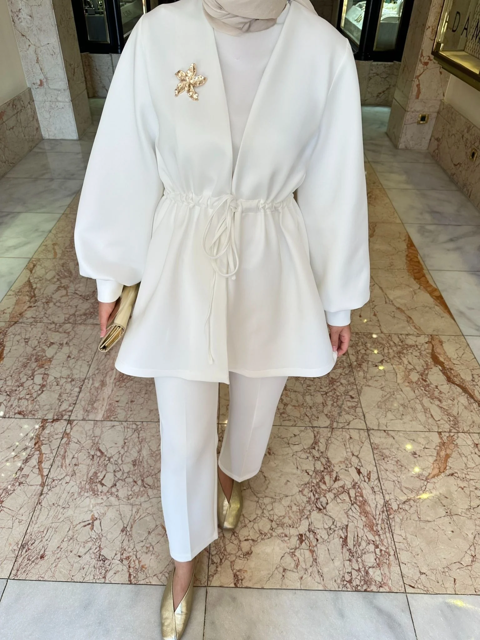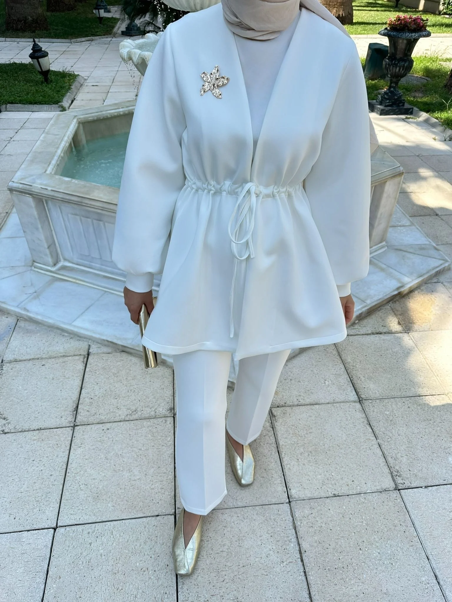 tuniği 82 cm, pantolon 95 cm uzunluğunda, şıklığı ve rahatlığı bir arada sunar.