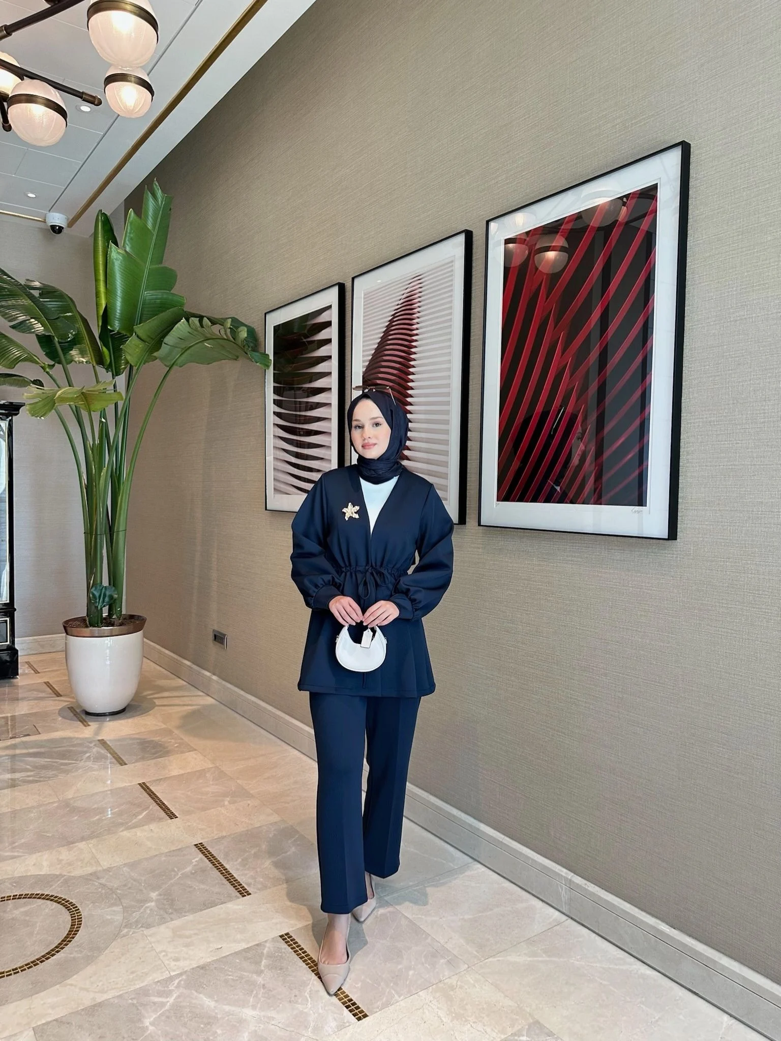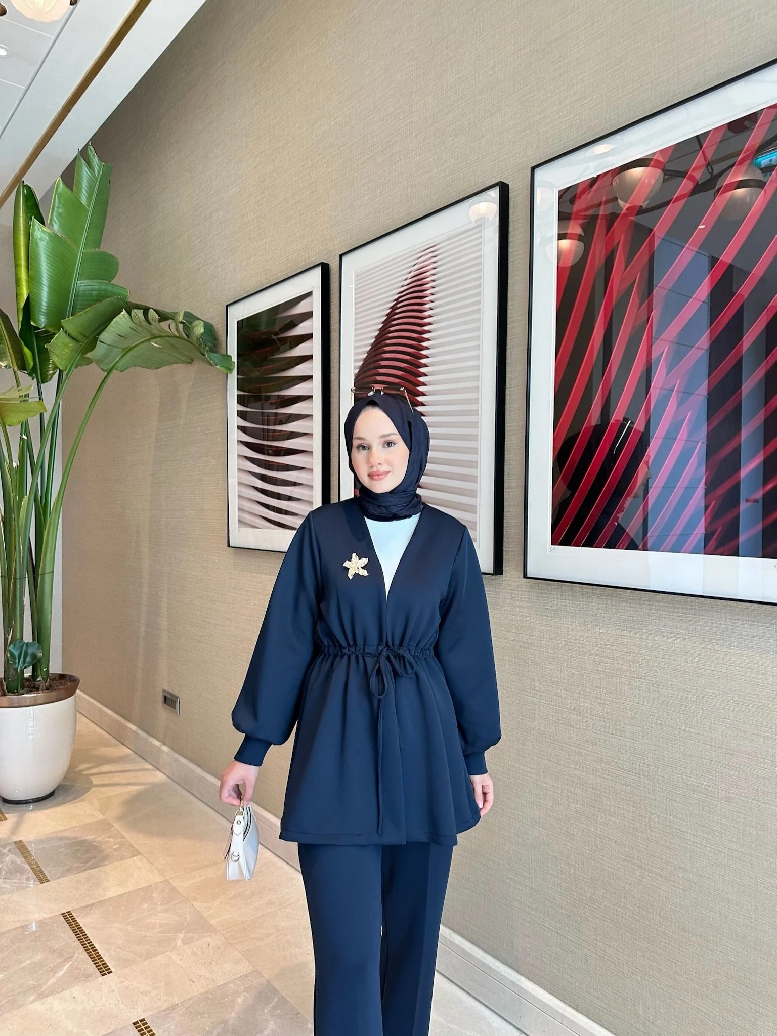 tuniği 82 cm, pantolon 95 cm uzunluğunda, şıklığı ve rahatlığı bir arada sunar.